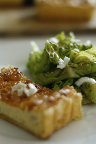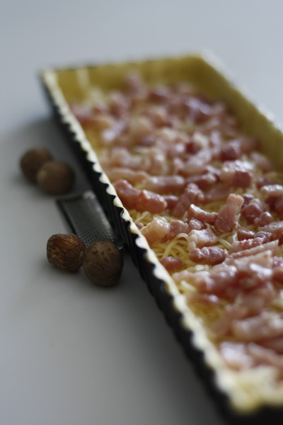 Abaisser la pâte dans le moule. La piquer à l’aide d’une fourchette. Étaler l’emmental et les lardons uniformément sur la pâte.