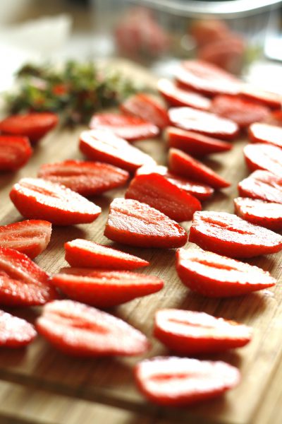 Couper les fraises en deux dans la longueur et les parsemer de sucre glace à l’aide d’une passoire, pour les faire briller.