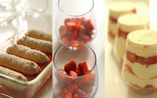 Dans un plat plat verser le coulis de fraises frais et y placer les biscuits à la cuillère. Les laisser s’imbiber environ 5 min en les retournant.