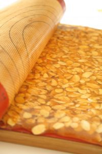 Avec un rouleau à pâtisserie étaler sur environ 5 mm d’épaisseur. Il faut aller assez vite car la nougatine se durcit vite.
