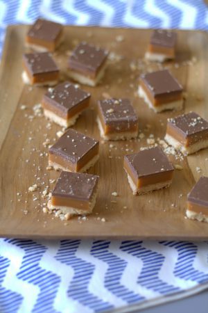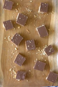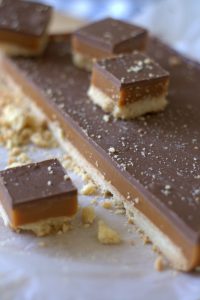 ( Si lors de la découpe le chocolat se fissure, c’est qu’il est trop froid. Attendre un peu que le chocolat reprenne quelques degrés pour découper les carrés de millionnaires).